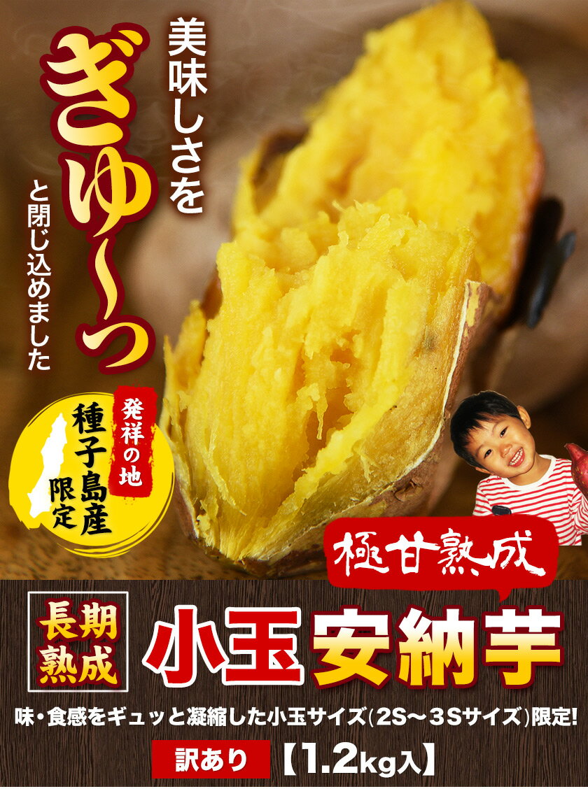 名称 さつまいも 産地 鹿児島県 種子島産 内容 種子島産安納芋1.2kg ■サイズ: ・小玉2S〜3Sサイズ(約50g〜25g前後) 賞味期限 1週間〜1ヶ月 生ものですのでお早めにお召し上がりください。